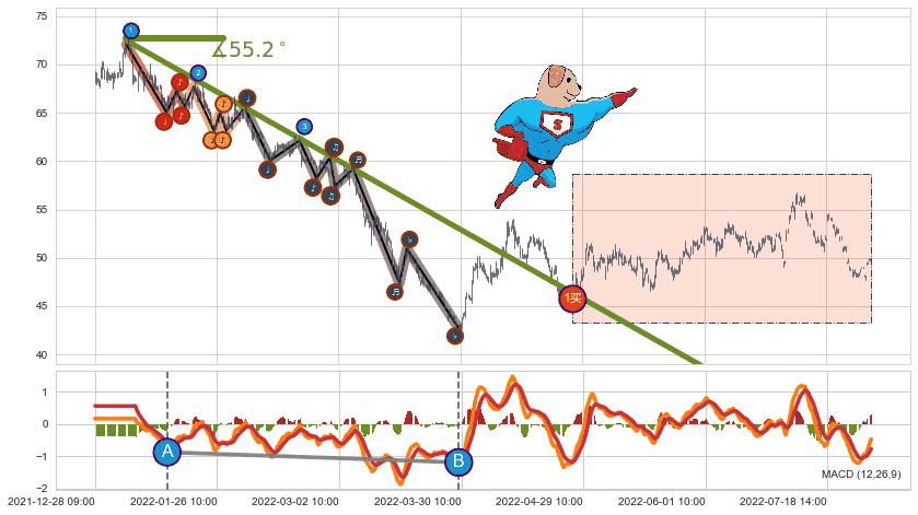 从2022-02-07 09:00至2022-04-11 14:00,共包含220个小时,阶段股价下跌-27.27%,阶段股价变动位移路程比: 1 : 6,下跌趋势角度: 60.8