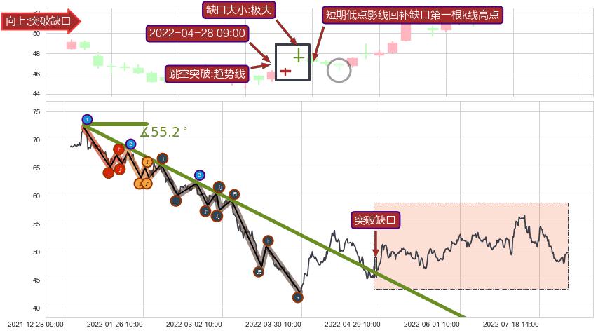 从2022-01-05 10:00至2022-04-11 14:00,共包含308个小时,阶段股价下跌-35.78%,阶段股价变动位移路程比: 1 : 6,下跌趋势角度: 55.2