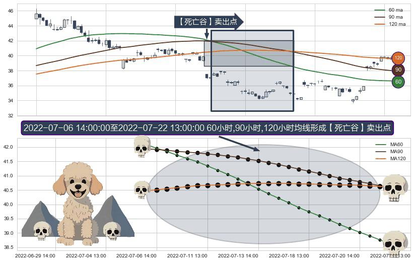 ⚀ 2022-07-07 13:00:00-小时至2022-07-22 13:00:00-小时显现 60小时-90小时-120小时均线 【死亡谷】卖出点 看空信号,后市看跌,卖出