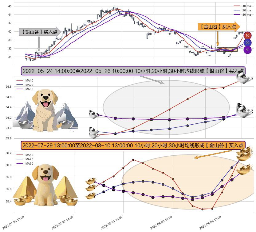 ⚃ 2022-07-29 14:00:00-小时至2022-08-10 13:00:00-小时显现 10小时-20小时-30小时均线 【金山谷】买入点 其再次确认了买入信号,可靠性更强,买入