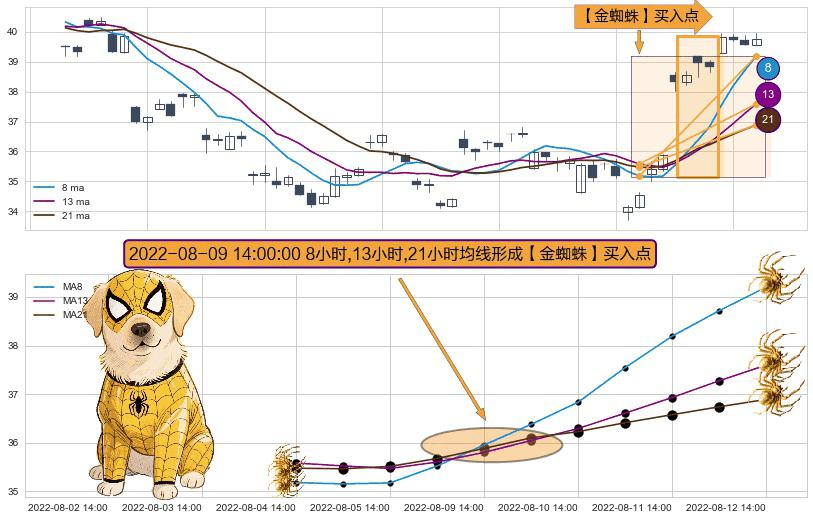 ⚀ 2022-08-09 14:00:00小时显现 8小时-13小时-21小时均线 【金蜘蛛】买入点 看多信号,后市看涨,买入