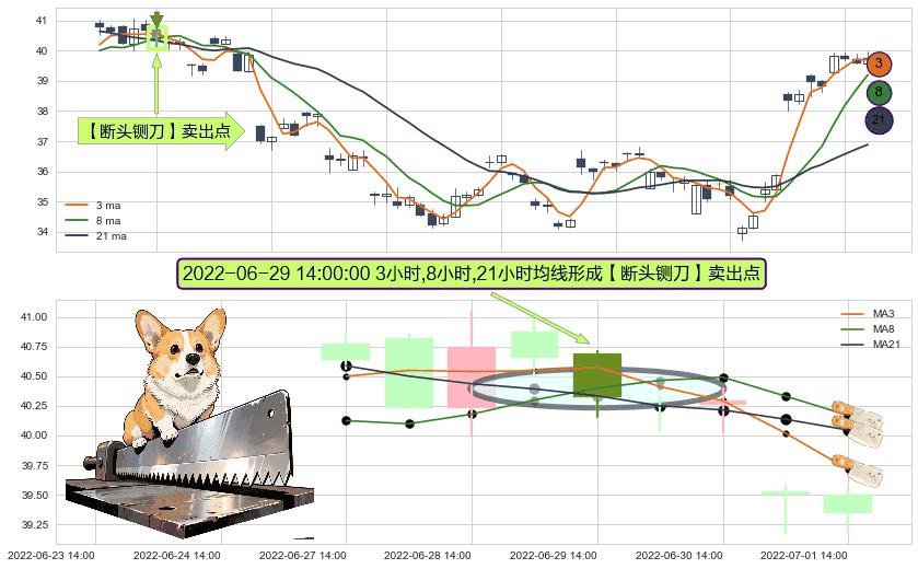 ⚀ 2022-06-29 14:00:00小时显现 3小时-8小时-21小时均线 【断头铡刀】卖出点 看空信号,后市看跌,卖出