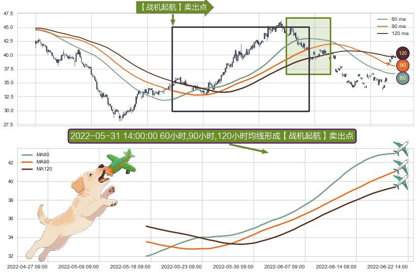 ⚀ 2022-05-13 13:00:00小时-2022-06-17 14:00:00小时显现 60小时-90小时-120小时均线 【战机起航】卖出点 看空信号,后市看跌,卖出