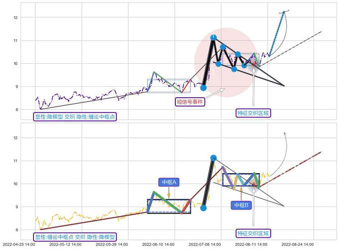 ➣ 缠论中枢点:猜想突破中枢B后持续拉升 → 上涨 → 突破中枢B阻力 → 持续趋势跟踪