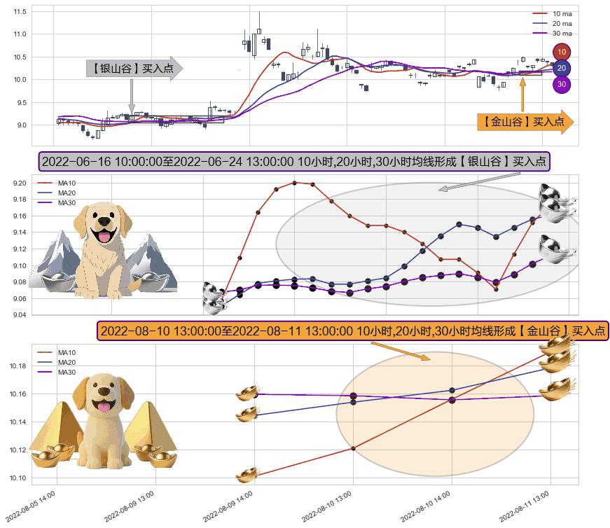 ⚃ 2022-08-10 14:00:00-小时至2022-08-11 13:00:00-小时显现 10小时-20小时-30小时均线 【金山谷】买入点 其再次确认了买入信号,可靠性更强,买入