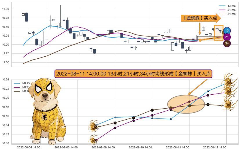 ⚀ 2022-08-11 14:00:00小时显现 13小时-21小时-34小时均线 【金蜘蛛】买入点 看多信号,后市看涨,买入