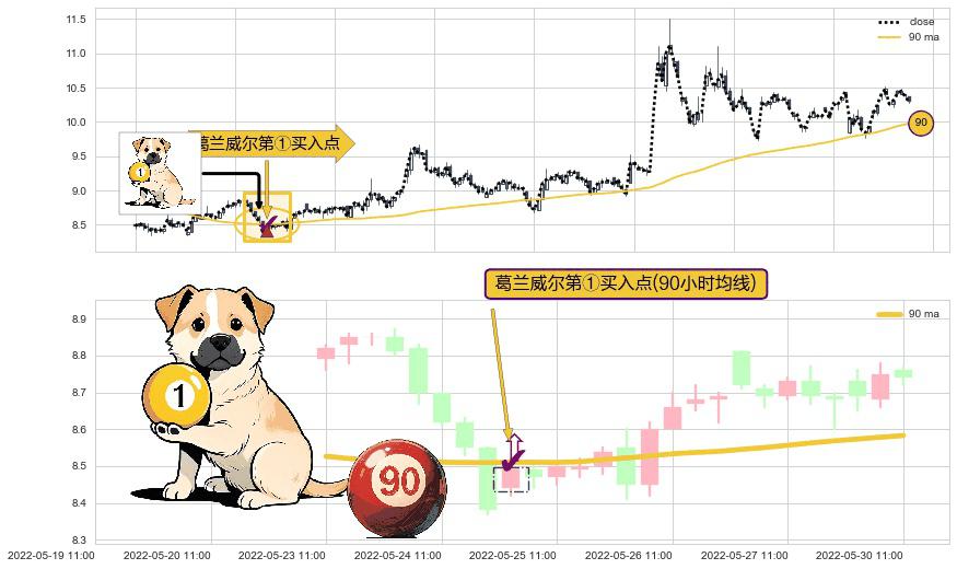 ⚀ 2022-05-25 09:00:00-小时显现 葛兰威尔均线 90小时均线 第买①入点 走势反转见底信号,后市看涨,买进信号