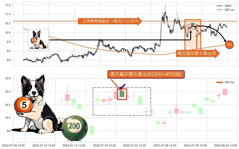⚀ 2022-07-20 13:00:00-小时显现 葛兰威尔均线 200小时均线 第⑤卖出点 上升趋势均值回复的短线回落信号,后市看跌,卖出信号