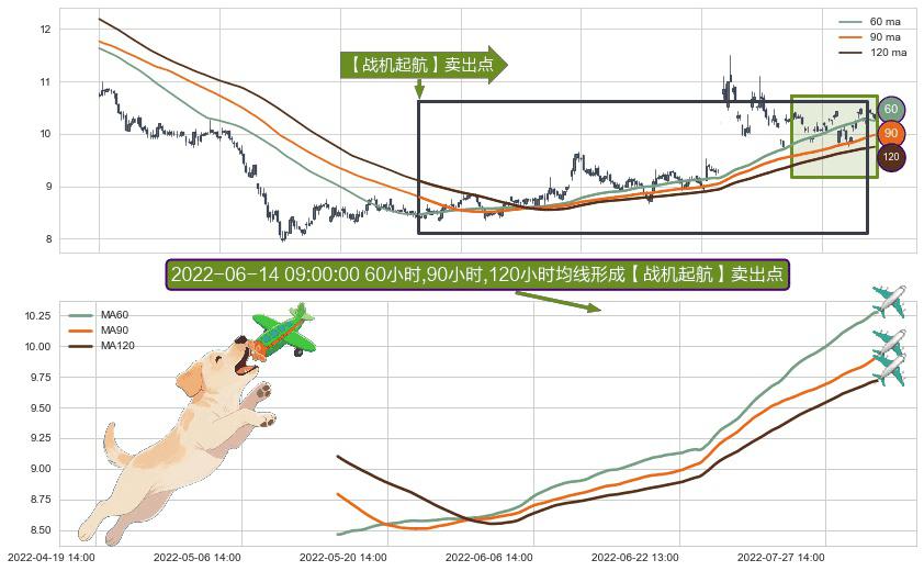 ⚀ 2022-05-17 11:00:00小时-2022-08-10 14:00:00小时显现 60小时-90小时-120小时均线 【战机起航】卖出点 看空信号,后市看跌,卖出