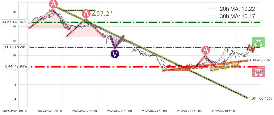 从2022-01-19 09:00至2022-05-11 10:00,共包含352个小时,阶段股价下跌-58.41%,阶段股价变动位移路程比: 1 : 4,下跌趋势角度: 57.2