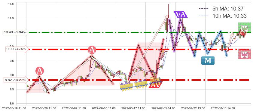♘ 阻力价格位10.49,可信任强度75.83%,距离最后交易2022-08-12 14:00形成的收盘价格10.29相差 +1.94%