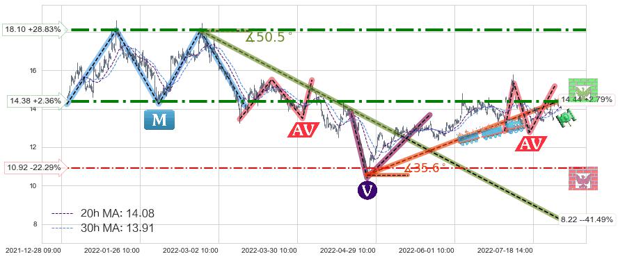 ♘ 阻力价格位14.38,可信任强度76.32%,距离最后交易2022-08-12 14:00形成的收盘价格14.05相差 +2.36%
