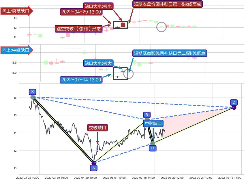 ➣ 突破缺口形成后,后续k已经超过14根,跳空突破【伽利】形态关键点后, 出现【完全回踩】迹象,短期收盘价回补缺口第一根k线高点