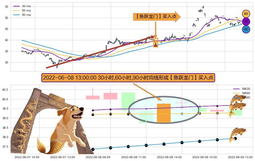 形态多维评估: ⚀ 2022-06-08 13:00:00小时显现 30小时-60小时-90小时均线 【鱼跃龙门】买入点 看多信号,后市看涨,买入