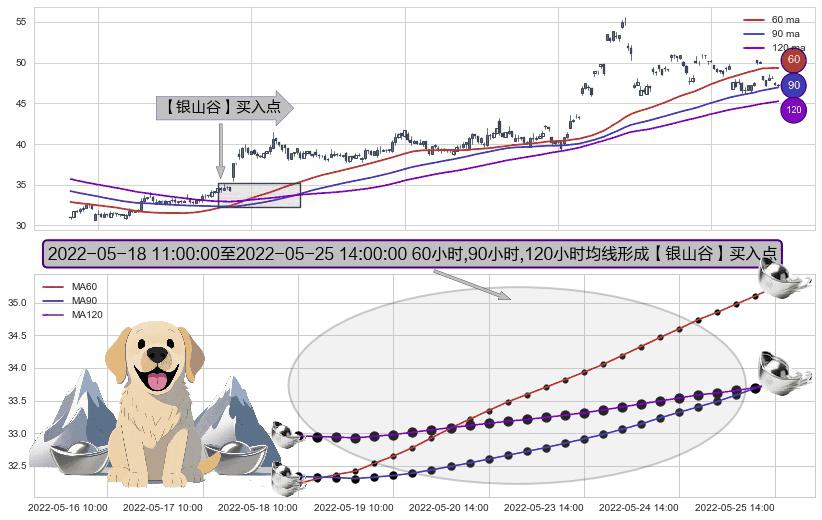 形态多维评估: ⚀ 2022-05-18 13:00:00-小时至2022-05-25 14:00:00-小时显现 60小时-90小时-120小时均线 【银山谷】买入点 看多信号,后市看涨,买入