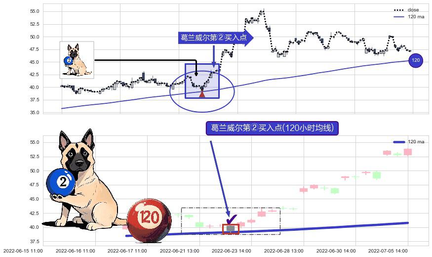 形态多维评估: ⚀ 2022-06-22 14:00:00-小时显现 葛兰威尔均线 120小时均线 第②买入点 上升趋势的中继信号,后市看涨,买进信号