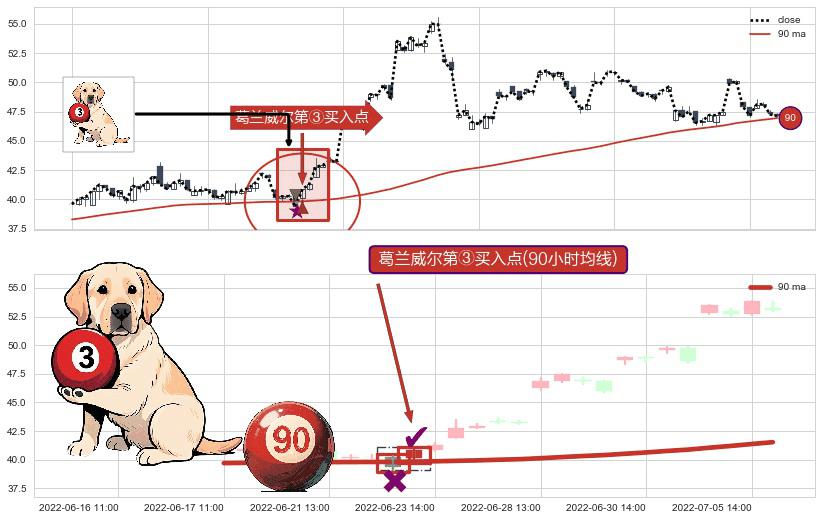 形态多维评估: ⚀ 2022-06-23 13:00:00-小时显现 葛兰威尔均线 90小时均线 第③买入点 上升趋势的中继信号,后市看涨,买进信号