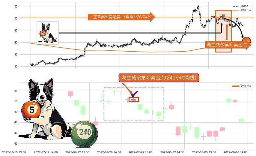 形态多维评估: ⚀ 2022-07-27 14:00:00-小时显现 葛兰威尔均线 240小时均线 第⑤卖出点 上升趋势均值回复的短线回落信号,后市看跌,卖出信号