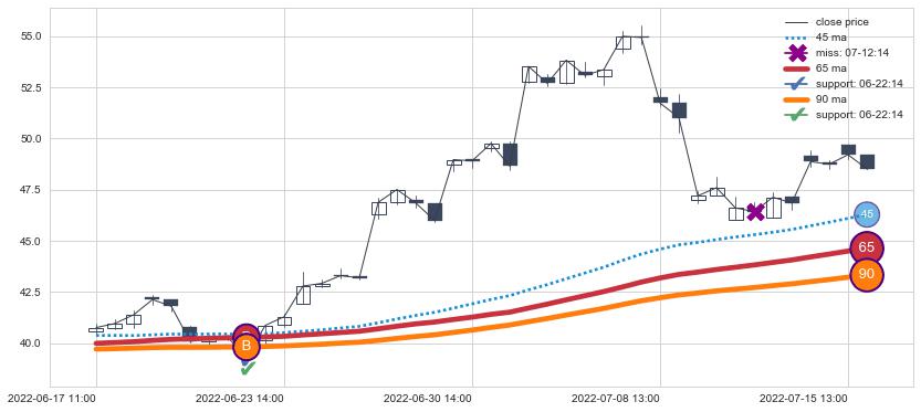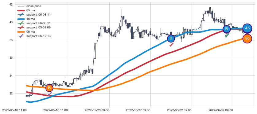 上涨趋势05-10 11:00-06-10 09:00,均线65, 90, 45确认关键支撑3处