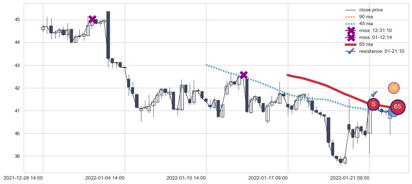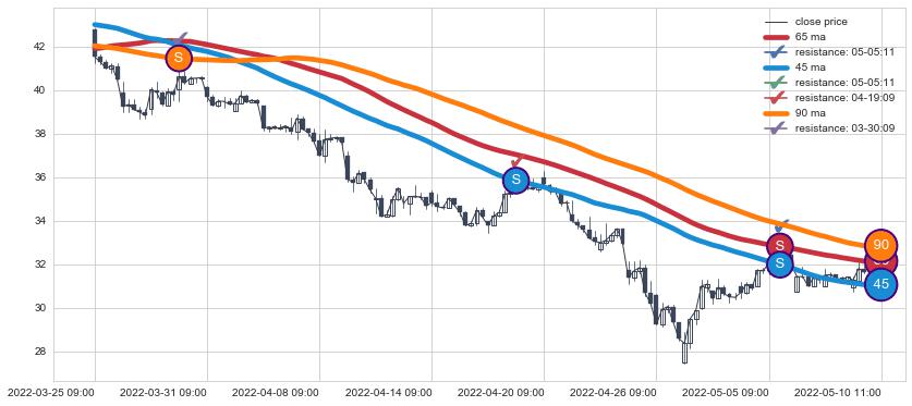 下跌趋势03-25 09:00-05-10 11:00,均线65, 90, 45确认关键阻力3处