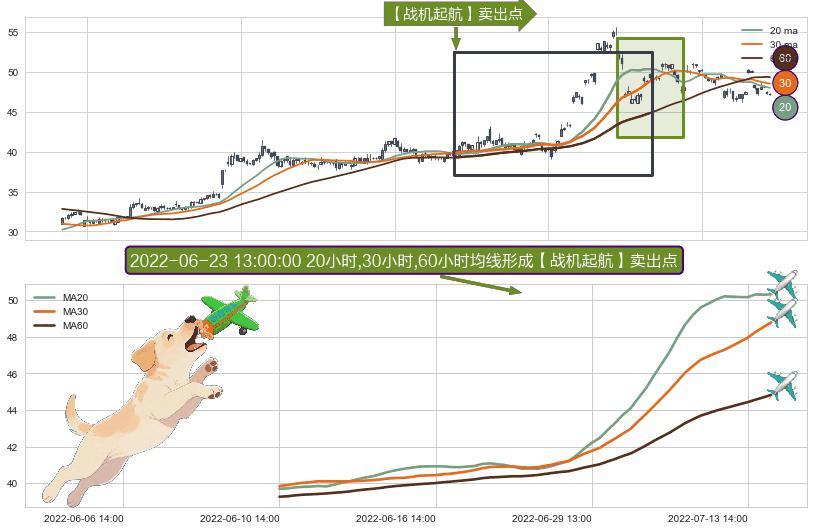 形态多维评估: ⚀ 2022-06-10 14:00:00小时-2022-07-15 13:00:00小时显现 20小时-30小时-60小时均线 【战机起航】卖出点 看空信号,后市看跌,卖出