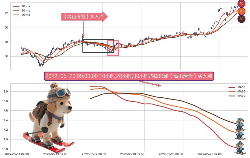 形态多维评估: ⚀ 2022-05-16 10:00:00小时-2022-05-25 14:00:00小时显现 10小时-20小时-30小时均线 【高山滑雪】买入点 看多信号,后市看涨,买入