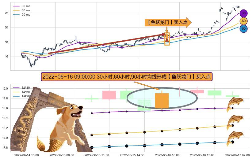 形态多维评估: ⚀ 2022-06-16 09:00:00小时显现 30小时-60小时-90小时均线 【鱼跃龙门】买入点 看多信号,后市看涨,买入