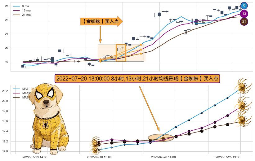 形态多维评估: ⚀ 2022-07-20 13:00:00小时显现 8小时-13小时-21小时均线 【金蜘蛛】买入点 看多信号,后市看涨,买入