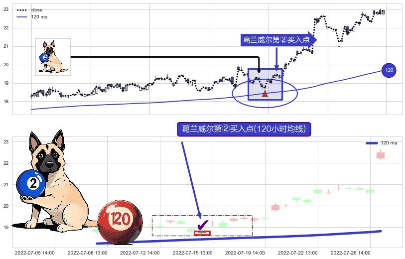 形态多维评估: ⚀ 2022-07-14 14:00:00-小时显现 葛兰威尔均线 120小时均线 第②买入点 上升趋势的中继信号,后市看涨,买进信号