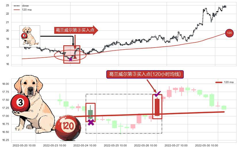 形态多维评估: ⚀ 2022-05-26 10:00:00-小时显现 葛兰威尔均线 120小时均线 第③买入点 上升趋势的中继信号,后市看涨,买进信号