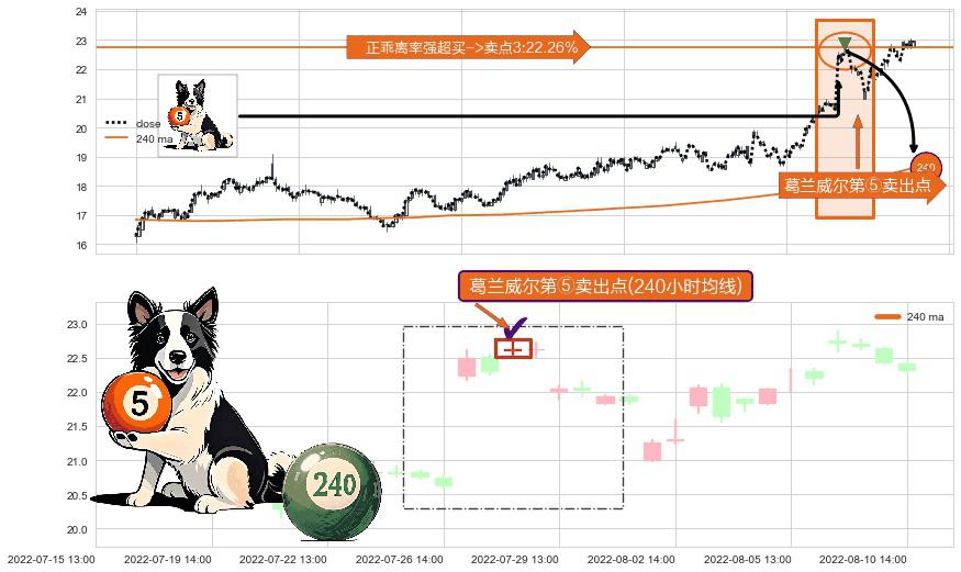 形态多维评估: ⚀ 2022-07-28 13:00:00-小时显现 葛兰威尔均线 240小时均线 第⑤卖出点 上升趋势均值回复的短线回落信号,后市看跌,卖出信号