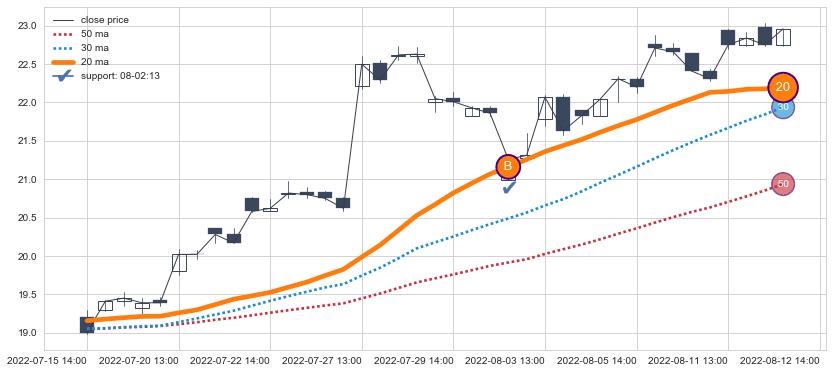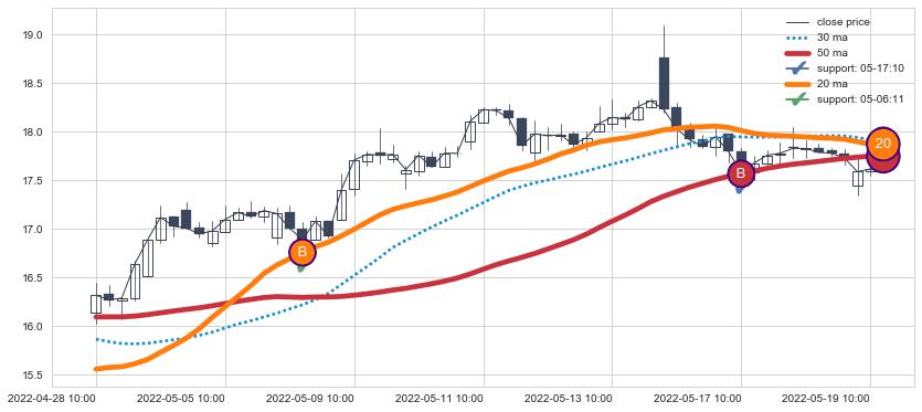 上涨趋势04-28 10:00-05-19 10:00,均线50, 20确认关键支撑2处
