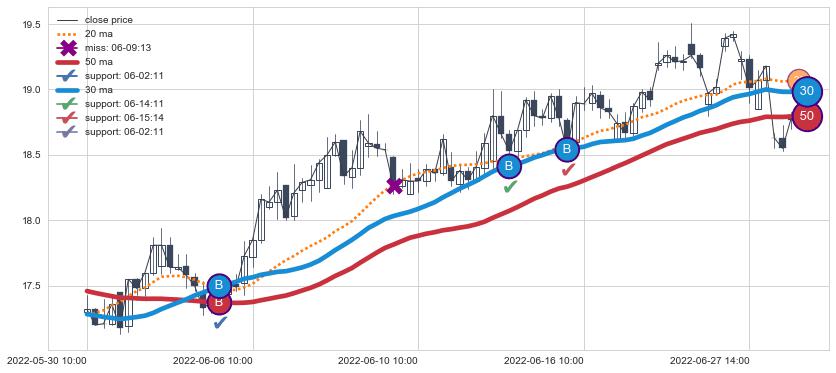 上涨趋势05-30 10:00-06-30 13:00,均线50, 30确认关键支撑3处