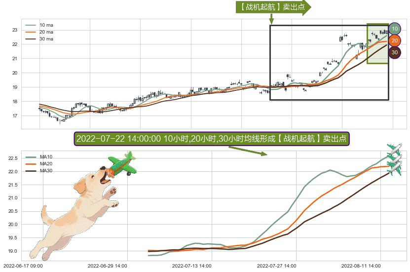 形态多维评估: ⚀ 2022-07-04 13:00:00小时-2022-08-12 14:00:00小时显现 10小时-20小时-30小时均线 【战机起航】卖出点 看空信号,后市看跌,卖出