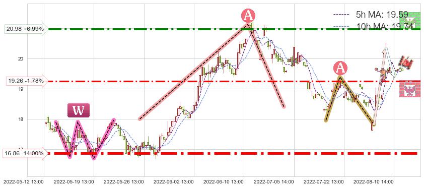 ♘ 阻力价格位20.98,可信任强度74.25%,距离最后交易2022-08-12 14:00形成的收盘价格19.61相差 +6.99%