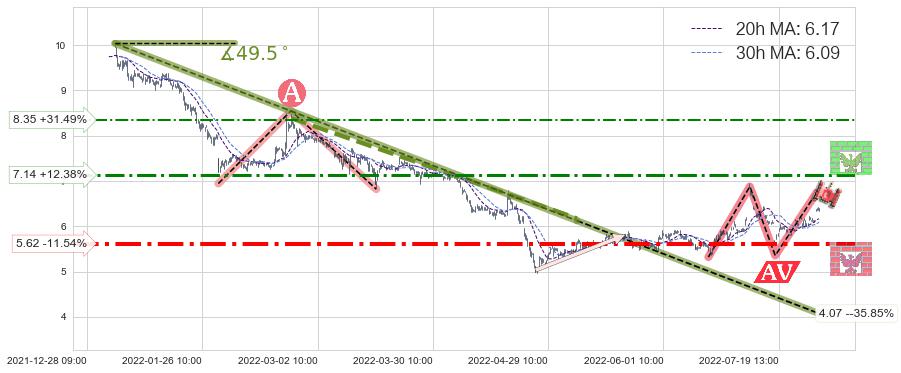 ♘ 阻力价格位7.14,可信任强度57.97%,距离最后交易2022-08-12 14:00形成的收盘价格6.35相差 +12.38%