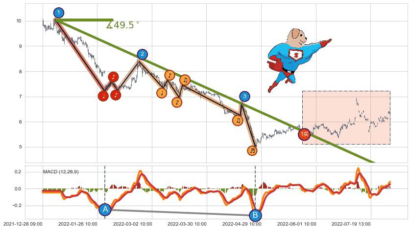 从2022-02-23 13:00至2022-05-11 10:00,共包含249个小时,阶段股价下跌-38.08%,阶段股价变动位移路程比: 1 : 4,下跌趋势角度: 49.2