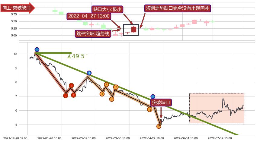 从2022-01-04 14:00至2022-05-11 10:00,共包含402个小时,阶段股价下跌-54.80%,阶段股价变动位移路程比: 1 : 5,下跌趋势角度: 49.5