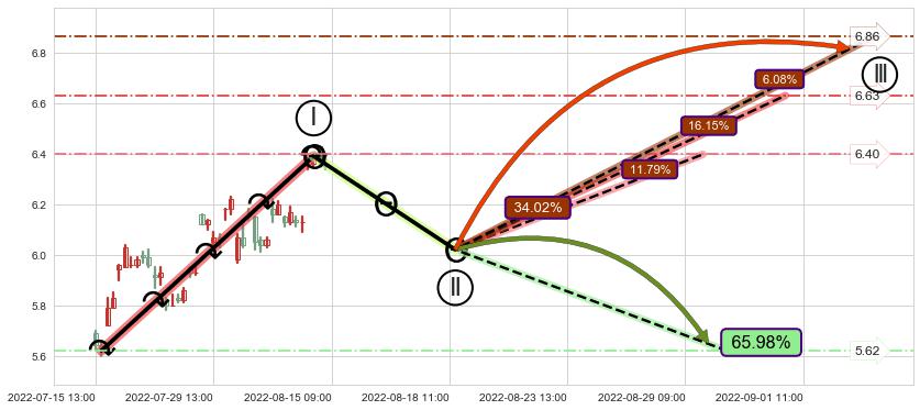 ♘ 支撑价格位5.86,可信任强度89.30%,距离最后交易2022-08-12 14:00形成的收盘价格6.35相差 -7.67%
