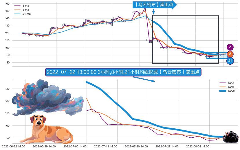 形态多维评估: ⚀ 2022-07-06 14:00:00小时-2022-08-09 14:00:00小时显现 3小时-8小时-21小时均线 【乌云密布】卖出点 看空信号,后市看跌,卖出