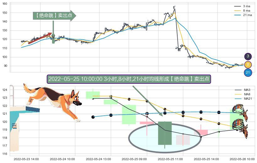形态多维评估: ⚀ 2022-05-25 10:00:00小时显现 3小时-8小时-21小时均线 【绝命跳】卖出点 看空信号,后市看跌,卖出