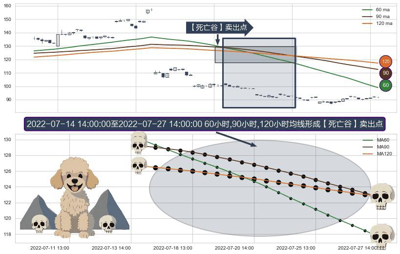 形态多维评估: ⚀ 2022-07-15 13:00:00-小时至2022-07-27 14:00:00-小时显现 60小时-90小时-120小时均线 【死亡谷】卖出点 看空信号,后市看跌,卖出