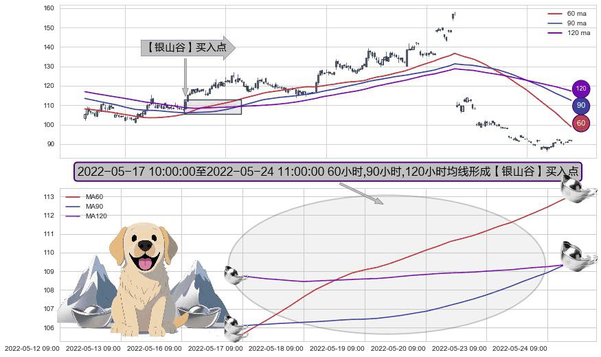 形态多维评估: ⚀ 2022-05-17 11:00:00-小时至2022-05-24 11:00:00-小时显现 60小时-90小时-120小时均线 【银山谷】买入点 看多信号,后市看涨,买入