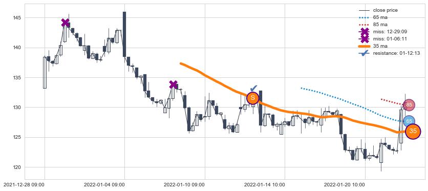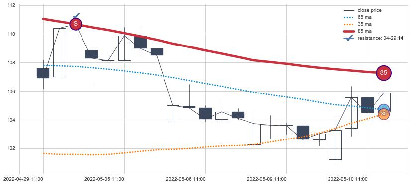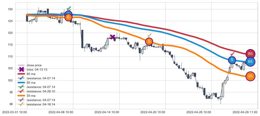 下跌趋势03-31 10:00-04-29 11:00,均线65, 35, 85确认关键阻力3处