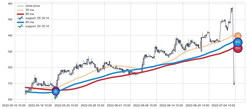 上涨趋势05-10 10:00-07-04 13:00,均线65, 85确认关键支撑1处