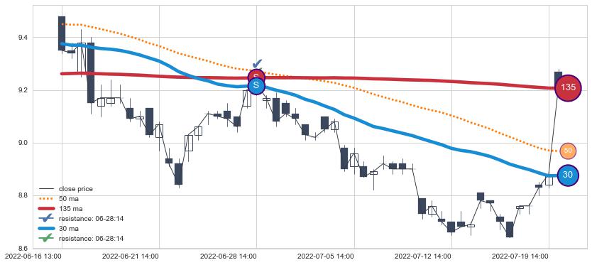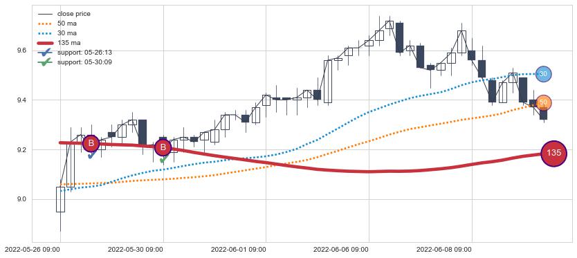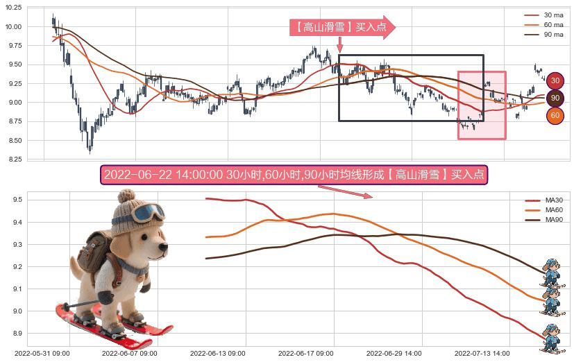 ⚀ 2022-06-09 10:00:00小时-2022-07-19 14:00:00小时显现 30小时-60小时-90小时均线 【高山滑雪】买入点 看多信号,后市看涨,买入