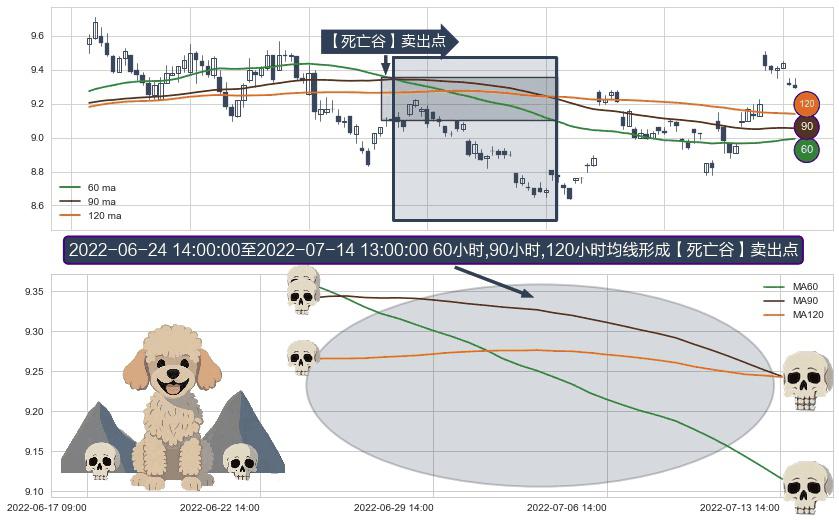 ⚀ 2022-06-27 13:00:00-小时至2022-07-14 13:00:00-小时显现 60小时-90小时-120小时均线 【死亡谷】卖出点 看空信号,后市看跌,卖出