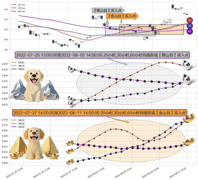 ⚀ 2022-07-28 13:00:00-小时至2022-08-11 14:00:00-小时显现 20小时-30小时-60小时均线 【金山谷】买入点 其再次确认了买入信号,可靠性更强,买入