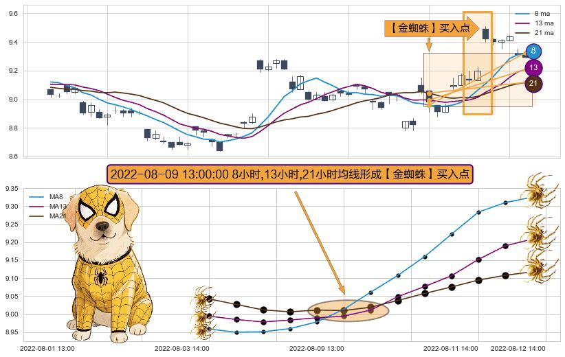 ⚀ 2022-08-09 13:00:00小时显现 8小时-13小时-21小时均线 【金蜘蛛】买入点 看多信号,后市看涨,买入