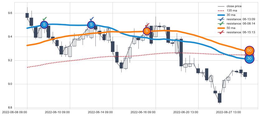 ⚀ 2022-06-16 13:00:00小时显现 20小时-30小时-60小时均线 【断头铡刀】卖出点 看空信号,后市看跌,卖出
